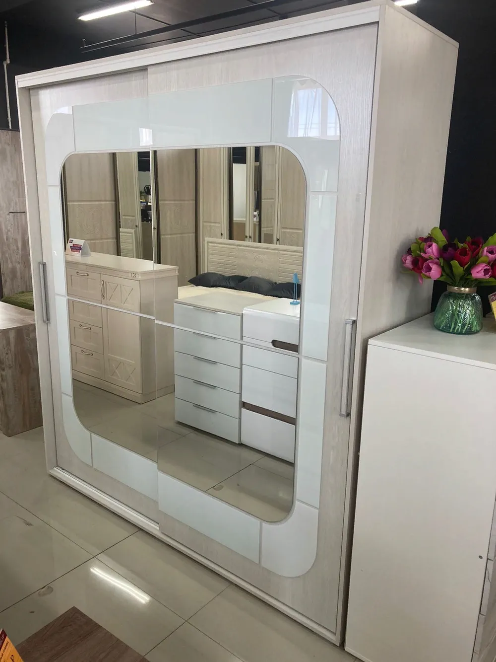 Декор: лакобель (белое), зеркала с фацетом.