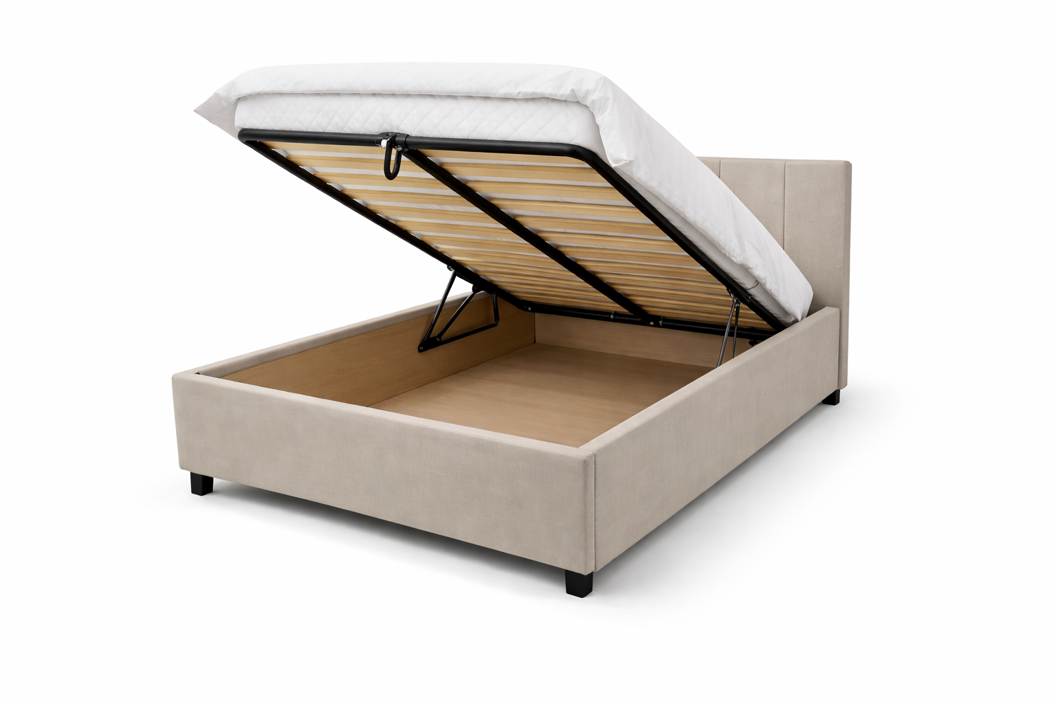 Кровать с каркасом, выполненным из светлой бежевой ткани, имитирующей дерево. Каркас имеет простую, но функциональную конструкцию, состоящую из боковых панелей и основания с ламелями. Ламели — это тонкие деревянные планки, которые обеспечивают поддержку матраса и позволяют воздуху циркулировать под ним, что способствует его долговечности и комфорту сна.