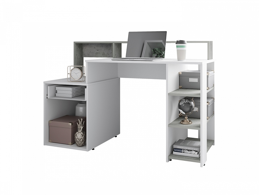 Универсальный компьютерный стол «Лайф» – это комфортное рабочее место, которое благодаря трендовому сочетанию белого цвета с декором «метрополитан грей» делает его неотъемлемой частью современного интерьера. Рациональное использование рабочего пространства продумано до мелочей. С одной стороны – тумба с распашным фасадом и выдвижным ящиком, которую можно использовать под принтер, с другой – удобная секция с открытыми полками, которая легко трансформируется в отдельное место для системного блока. При использовании верхней надстройки появляется дополнительное место для размещения важных мелочей. Этот стол собирается зеркально.